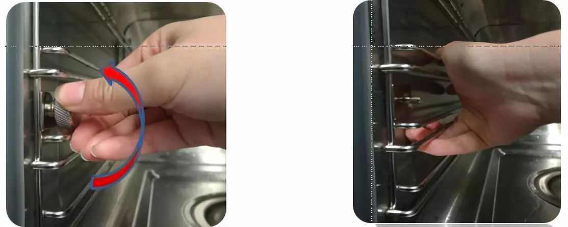 温馨提示:清洁内胆前,先取出两边的侧支架(将两边固定的旋钮拧下即可取下支架),清洁会更容易。关上蒸箱门前,确保内胆已完全干透。