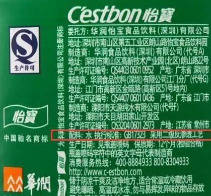 先看一下怡宝的标签,配料是水,后面说明是采用二级反渗透工艺制取的;同时我们在看看哇哈哈的说明。