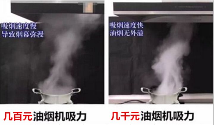第一方面差的是“吸烟效果”,劣质吸油烟吸烟速度慢,常常导致厨房中烟雾弥漫,无法把油烟吸干净;而优质吸油烟机吸烟速度快,并且油烟无外溢油烟吸净率较高,如上图所示同样的负压区,吸力及吸烟效果差异很大。