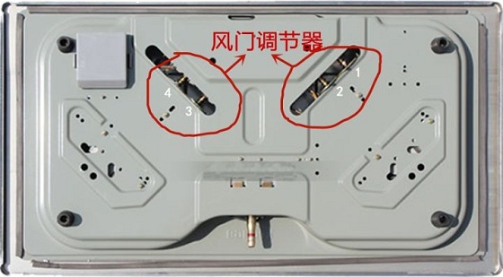 一般风门在燃气灶底部有两个风门调节器,如下图。
