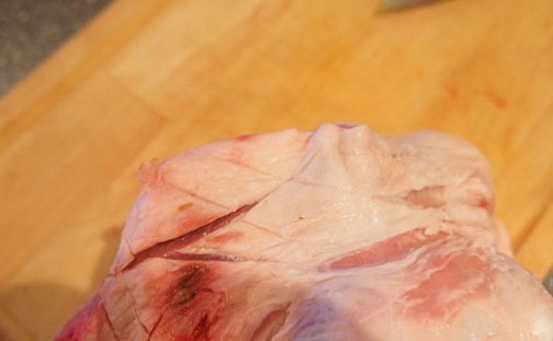 在脂肪比较厚的地方随便切几刀,这是为了方便入味。