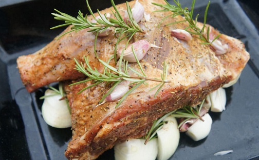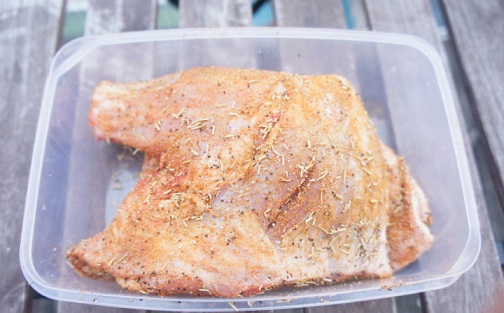 把羊腿从冰箱拿出来,表面抹一层油。不要怕油多不健康,最后这些油都会流到下面去的。