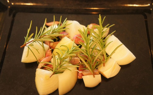搞定洋葱和蒜,表面洗干净就好了,然后洋葱切大块,蒜掰成瓣,不需要去皮。再搞点新鲜迷迭香。