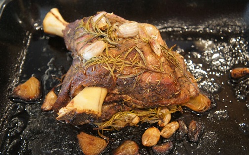 把垫底的料和油留在烤盘里,羊腿装盘就能上桌吃了。